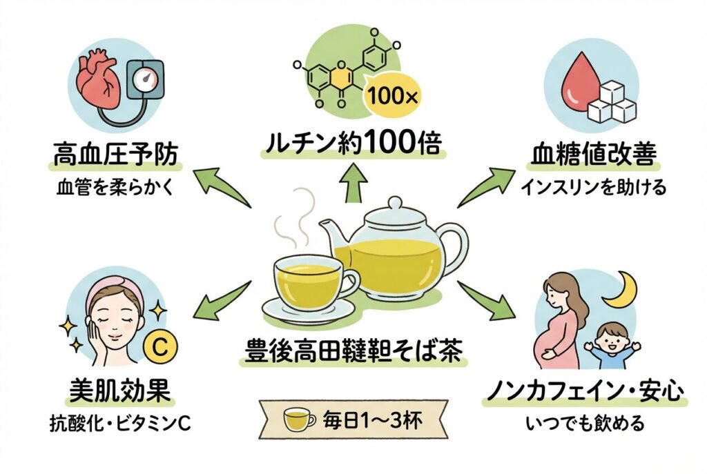 豊後高田韃靼そば茶の最大の魅力は、健康成分「ルチン」が普通のそば茶の約100倍も含まれていることです。ルチンは血管を強くする働きがあり、さまざまな健康効果が期待できます。