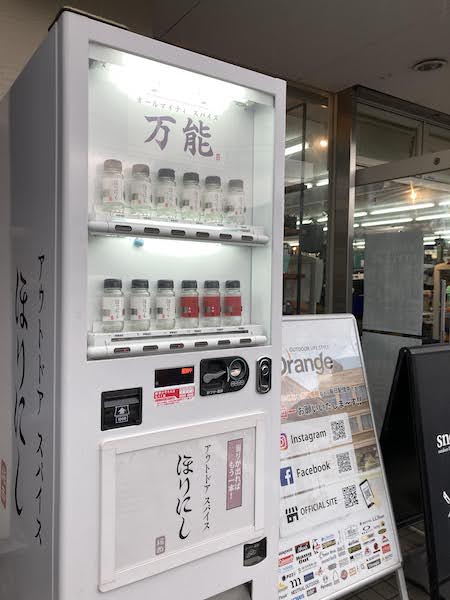 「ほりにし」は自販機で買える場所があります。和歌山県かつらぎ町のアウトドアショップ Orange の店頭に設置された自動販売機で、24時間いつでも購入可能です。