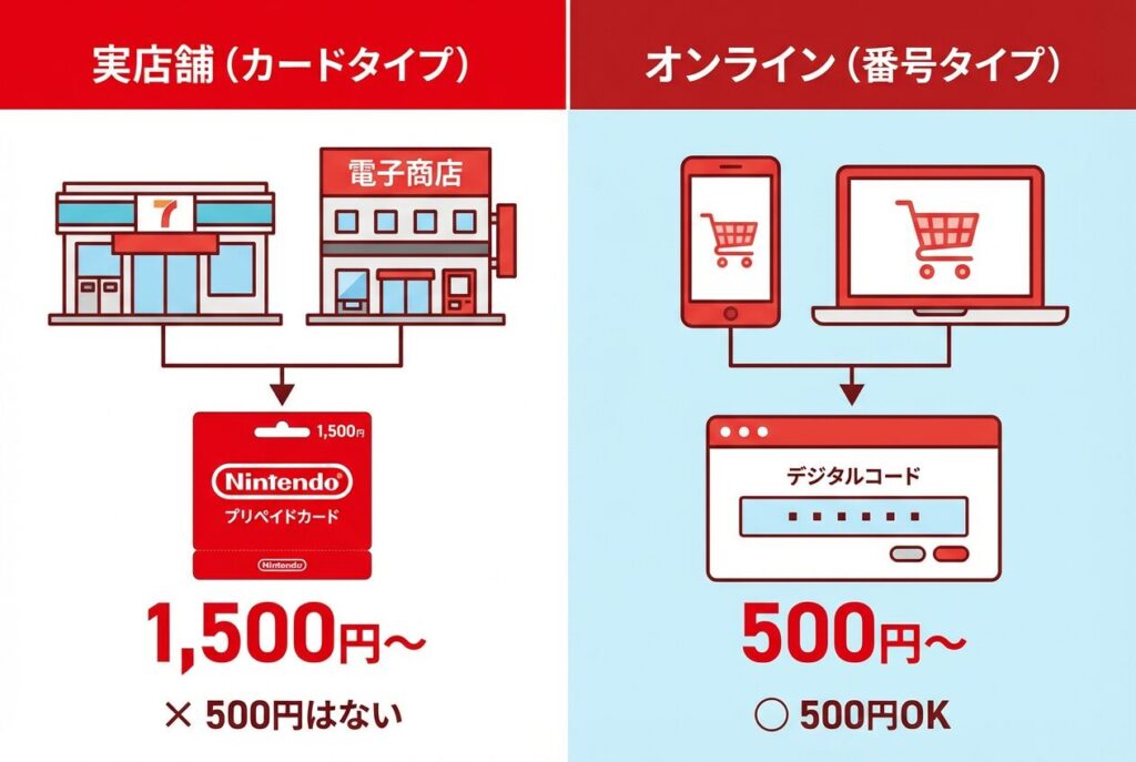 ニンテンドープリペイドには、「カードタイプ」と「番号タイプ」があり、購入できる最低金額が違います。