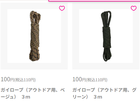 - ダイソー:アウトドア用品コーナーにて、パラコードが販売されています。