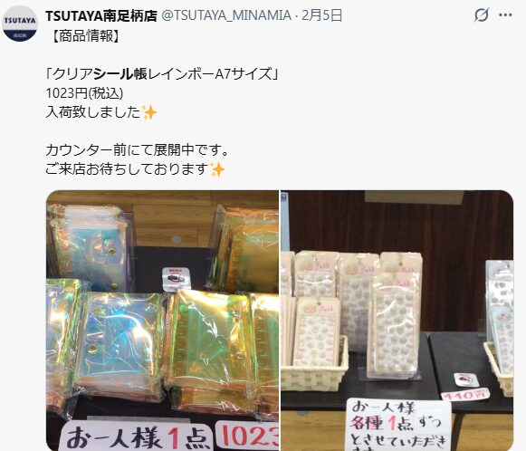 各店舗でシール帳やボンボンドロップシール対応のバインダーを扱っており、2026年1月にはTSUTAYA首里店、伊那店、八女店などで入荷報告がありました。